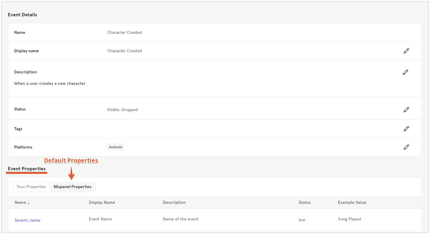 | Display Name | The event name that displays in the Mixpanel interface. |