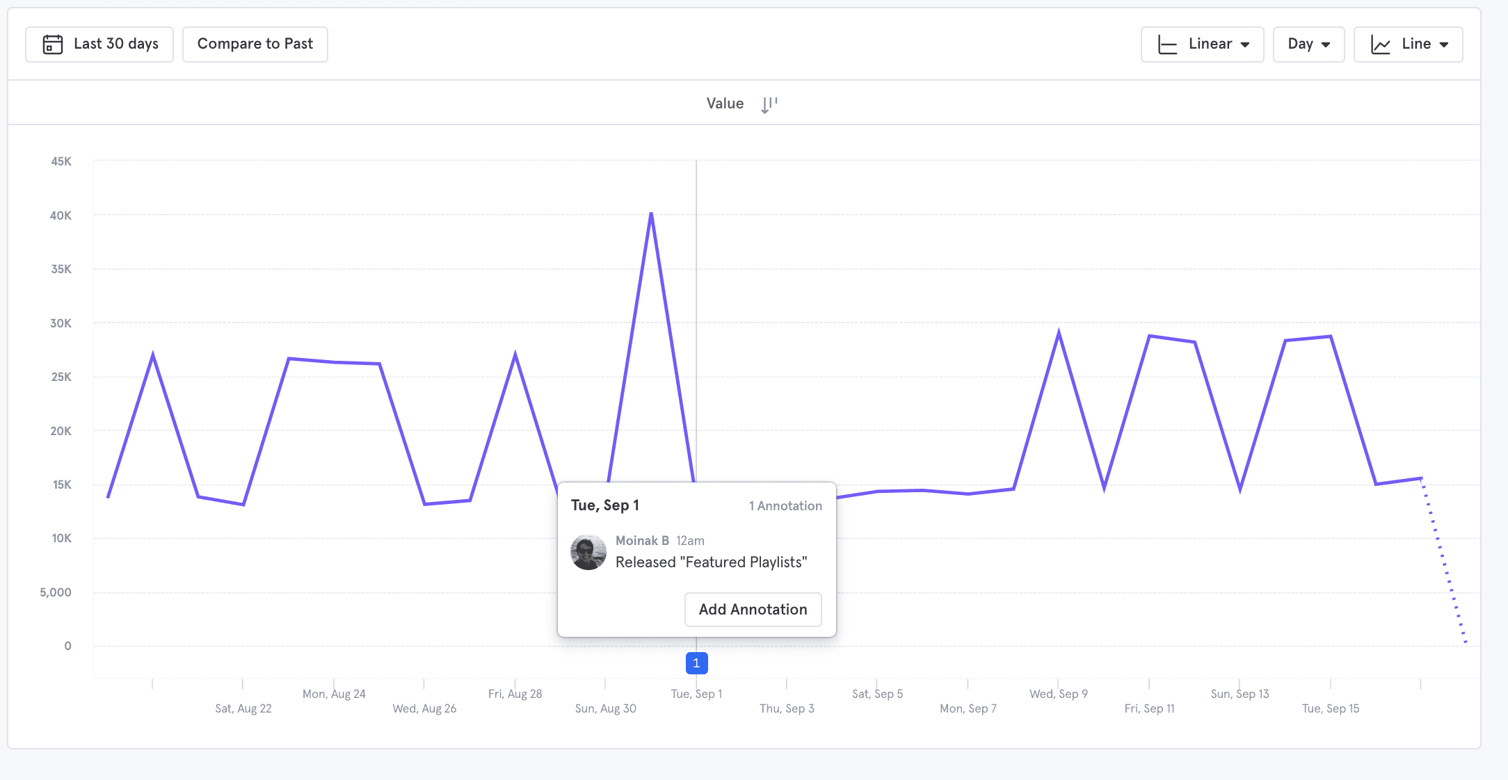 To add an annotation, hover your mouse over the point on the chart you want to annotate, and click the blue + button that appears. Enter a description for the annotation, such as a holiday that occurred on that day or the end date of your fiscal year, then click Save. If you accidentally selected the incorrect date on the chart, you can edit the date and time of the annotation in this window.